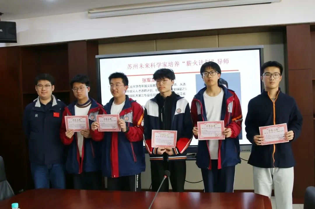 “苏州未来科学家薪火计划”导师制项目以培养中学生科创后备人才为目的,由苏州市科学技术协会、苏州市教育局联合在全市范围内开展,依托苏州市高校及科研院所的专家人才和科教设施资源,结合学校的学科基地、特色科技创新项目的建设基础,选拔部分优秀学生参与培养计划,旨在激发学生的科学兴趣,开阔科学眼界。我校高一年级共有5位同学凭借出色的综合素质脱颖而出,成功入选该项目,并有幸与哈尔滨工业大学青年拔尖副教授、博士生导师张军龙结对。