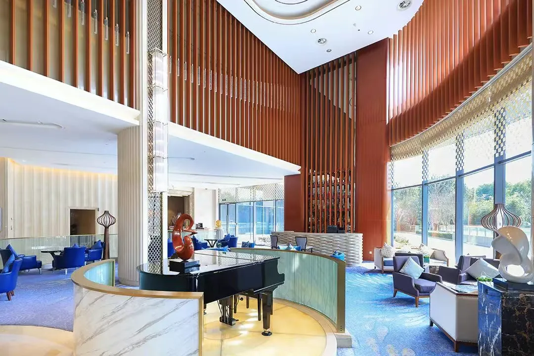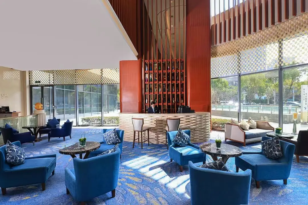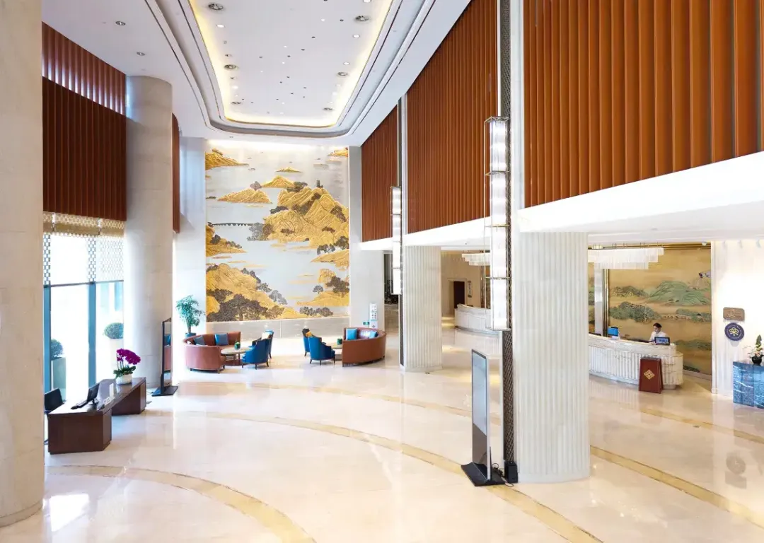 步入酒店高挑透亮的大堂,迎面而来的就是一幅8米长水墨丹青画卷!大理石前台、华丽吊灯水晶灯...雍容大气中融入了江南水乡的典雅与优美,透露着低调的奢华。