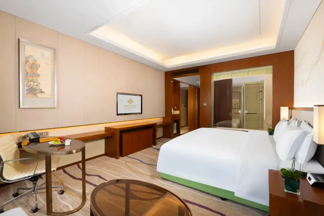 客房设计上主打典雅的深木色,搭配苏式雅韵的床头背景山水画、地毯等,处处传递着江南风情。