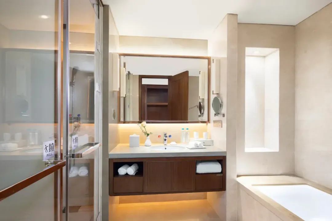 配套齐全,干湿分离的洗浴间,设施高端,还贴心地配有一个大浴缸。此外,还有很多贴心细节,如带小朋友入住,致电前台,会送来儿童牙膏牙刷,拖鞋等。