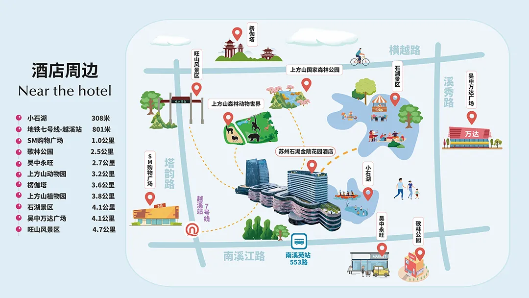酒店东临小石湖,北靠生态公园,过个马路就能GET湖水依依,距离苏州地铁7号线也不过800米,周边环境优美,风景秀丽,关键是各种商场都很齐全,看够了风景,一键开启SHOPPING逛街模式。
