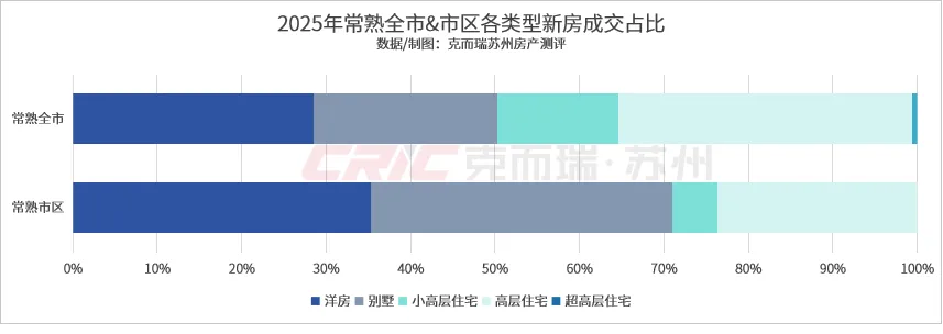 可以看到,从产品类型来看,常熟尤其是市区范围内,洋房和别墅产品成交占比明显居高,可见新房市场的2025年的深度改善化趋势也是伴随着低密化趋势同步进行的。