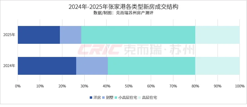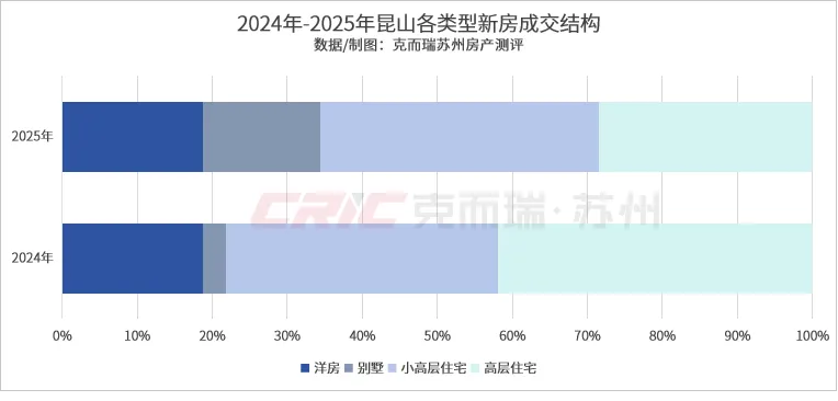 可以看到,虽然新房主力成交依然以小高层和高层为主,但别墅产品2025年成交占比有明显提升,可见昆山这一年新房供求结构也正朝着低密化的趋势在进行调整深化。