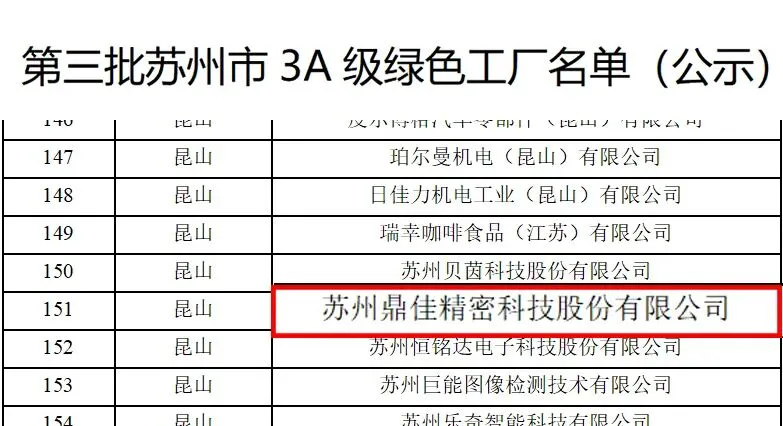 鼎佳精密成功入选苏州市第三批3A级绿色工厂公示名单