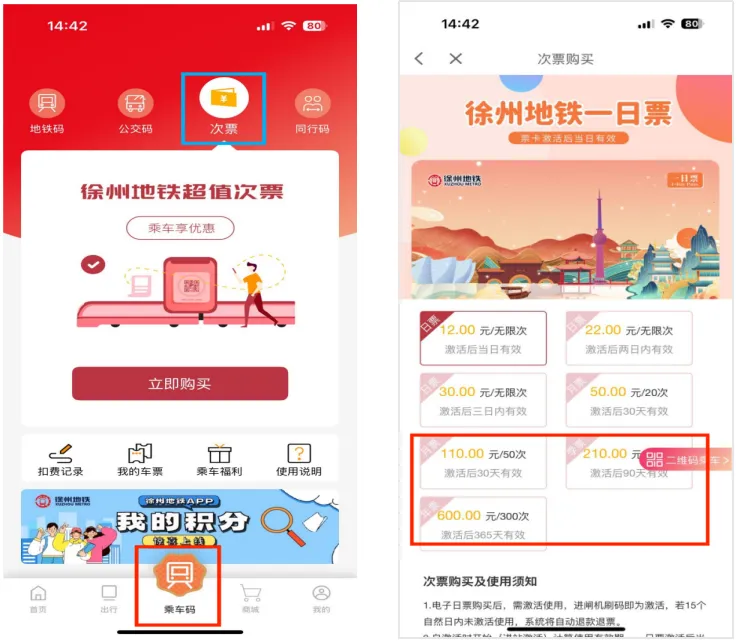 3.APP月票、季票及年票 均为电子次卡,仅限徐州地铁APP二维码进闸使用。购买后需15日内激活使用(如未使用自动退款,次卡失效),包含月票、季票、年票,到期失效,剩余次数不退。操作指南如下: