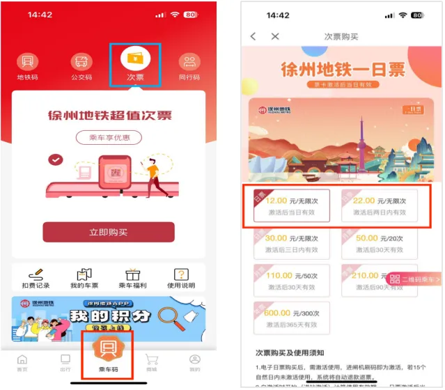 包括电子期限票和实体期限票,有效期内乘坐地铁不限里程、不限次数,具体包含一日票(12元)、二日票(22元)、三日票(30元)。电子期限票通过徐州地铁APP购买和使用,实体期限票至车站客服中心购买(1号线徐州东站、彭城广场站、徐州火车站,2号线彭城广场站、户部山站,3号线徐州火车站、蟠桃站,6号线徐州东站)。