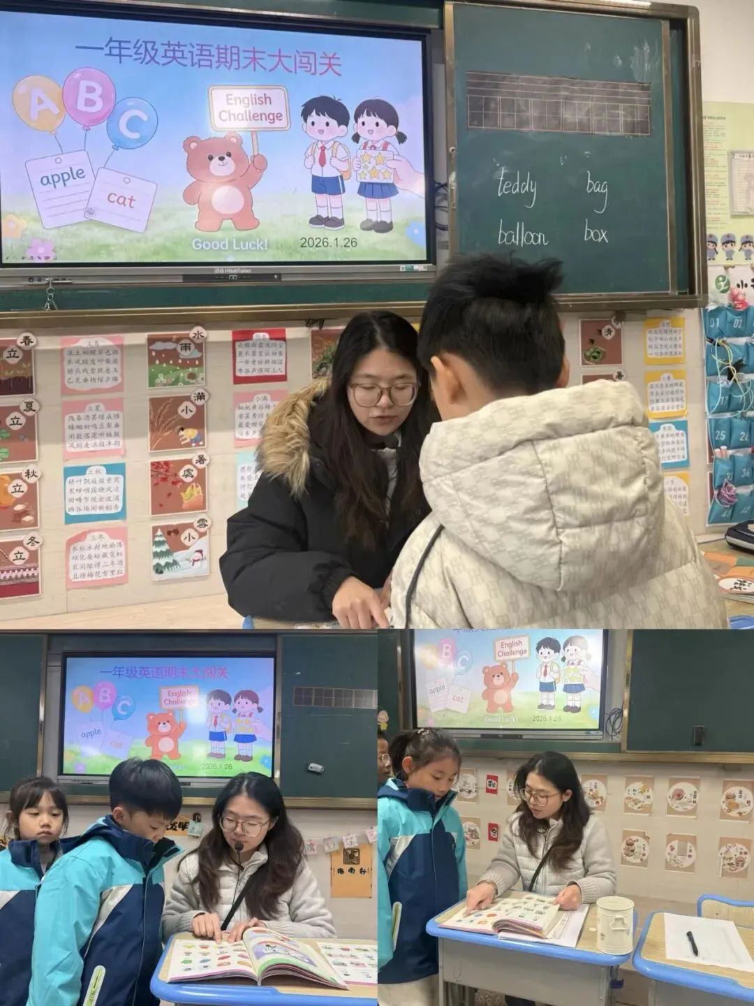 英语闯关设置“单词盲盒大作战”“句子朗读”“听音选词”三项任务,孩子们从盲盒中抽取卡片大声认读,准确翻译句子、快速匹配听力图片,在互动中夯实英语基础。