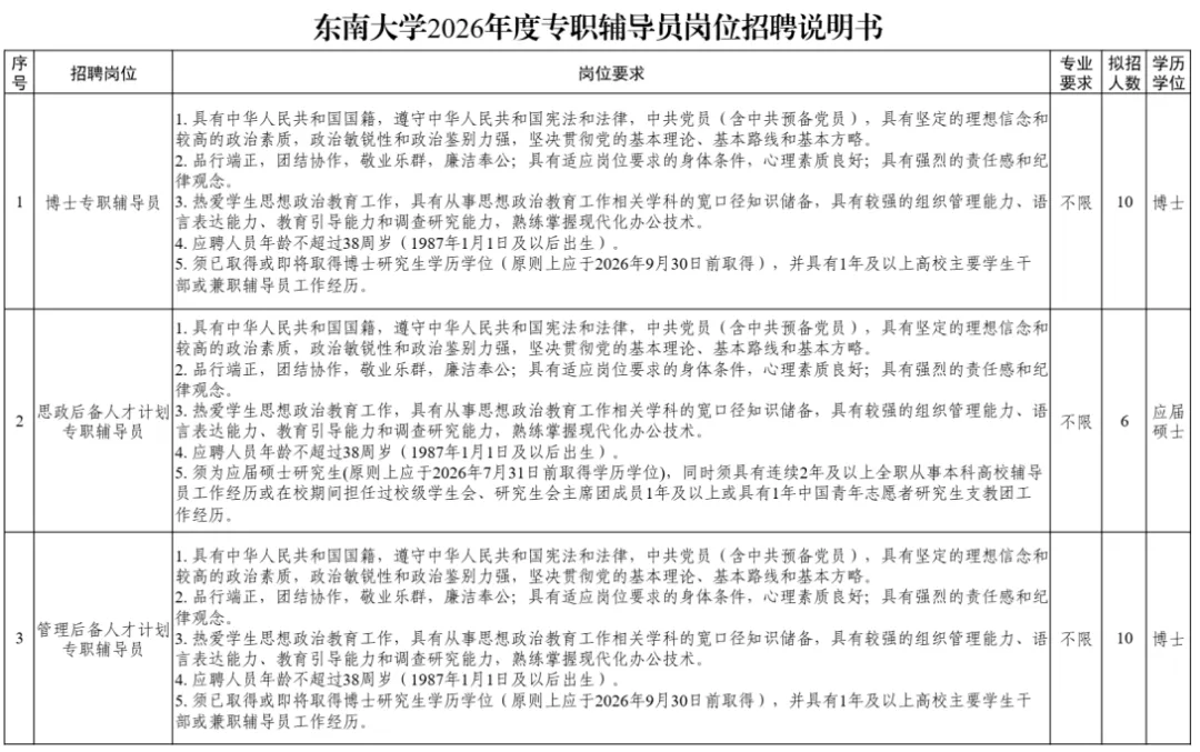 东南大学坐落于钟灵毓秀、虎踞龙蟠的金陵古都——南京,是享誉海内外的著名高等学府,学校是国家教育部直属并与江苏省共建的全国重点大学,是国家“985工程”和“211工程”重点建设大学之一。2017年,东南大学入选世界一流大学建设A类高校名单。为适应新时代东南大学“双一流”建设要求,现面向社会公开招聘事业编制专职辅导员26名。具体信息如下:1. 博士专职辅导员:10名,全职从事辅导员工作。2. 思政后备人才计划专职辅导员:6名,全职从事辅导员工作,并在规定聘期内完成博士研究生阶段学习、取得学历学位。3. 管理后备人才计划专职辅导员:10名,前两年全职从事辅导员工作;两年期满考核合格者,可经择优双向选择聘任至校内管理岗位。具体岗位职责及要求详见《东南大学2026年度专职辅导员岗位招聘说明书》,见附件。1. 具有中华人民共和国国籍,遵守中华人民共和国宪法和法律,中共党员(含中共预备党员),具有坚定的理想信念和较高的政治素质,政治敏锐性和政治鉴别力强,坚决贯彻党的基本理论、基本路线和基本方略。2. 品行端正,团结协作,敬业乐群,廉洁奉公;具有适应岗位要求的身体条件,心理素质良好;具有强烈的责任感和纪律观念。3. 热爱学生思想政治教育工作,具有从事思想政治教育工作相关学科的宽口径知识储备,具有较强的组织管理能力、语言表达能力、教育引导能力和调查研究能力,熟练掌握现代化办公技术。4. 应聘人员年龄不超过38周岁(1987年1月1日及以后出生);5. 应聘博士专职辅导员、管理后备人才计划专职辅导员,须已取得或即将取得博士研究生学历学位(原则上应于2026年9月30日前取得),并具有1年及以上高校主要学生干部或兼职辅导员工作经历。6. 应聘思政后备人才计划专职辅导员,须为应届硕士研究生(原则上应于2026年7月31日前取得学历学位),且符合下列条件之一:(1)具有连续2年及以上在本科高校全职从事辅导员工作的经历;(2)在校期间担任校级学生会或研究生会主席团成员满1年;(3)具有1年中国青年志愿者研究生支教团工作经历。(2)涉嫌违纪违法,正在接受审查调查尚未作出结论;2026年1月31日起至2026年3月6日登录东南大学招聘系统http://zp.ehall.seu.edu.cn进行网上报名,按照系统提示填写申报信息, 选择意向岗位,材料填写不全者视为放弃报名。报名截止后,所有报名信息将不能更改。1. 根据系统提示填写基本信息、学习经历(学历学位证书扫描件及学信网证明)、工作经历(劳动/聘用合同或社保缴纳证明,学生干部工作经历须提供学校团委等相关部门开具的工作证明)等,并严格按要求上传附件材料。个人信息及相关表格信息应填写完整,个人经历须保持连续,应聘人员无法提供附件材料、提供的附件材料不符合要求,或存在弄虚作假行为的,学校有权取消其报名或录用资格。(2)应聘人员与所应聘岗位的部门负责人和公开招聘工作人员有夫妻关系、直系血亲关系、三代以内旁系血亲关系、近姻亲关系或者其他《事业单位人事管理回避规定》中须回避的亲属关系的,以及应聘人员与现有在岗人员存在上述关系,且到岗后又有直接上下级领导关系的;(3)国家和江苏省其他规定不得参加事业单位应聘的人员。3. 本次招聘只接受通过东南大学招聘系统网上报名,不接受书面或电子邮件报名。学校根据岗位招聘基本条件进行资格审查,确定进入初试人员名单。学校组织初试,确定进入笔试人员名单。在笔试成绩合格人员中,按照招聘岗位从高分到低分依次确定进入面试的人选。学校组织两轮面试,主要围绕岗位职责考察应聘者胜任情况和综合素质,具体形式、流程安排和时间地点将另行通知。考试考核结束后,按岗位从合格人员中按高分到低分确定参加体检人员。体检标准参照《国家公务员录用体检通用标准(试行)》执行。因体检不合格等原因出现招聘岗位空缺时,在考核合格人员中,根据学校进人会面试成绩从高到低进行递补。学校对体检合格的拟录用人员进行考察。根据任职要求和岗位条件,重点考察其思想政治表现、道德品质、相关业务能力和工作实绩,并根据考察结果确定拟录用人员名单。拟递补人员暂不体检和考察,需递补时再另行通知。在考察中发现有下列情况之一者,取消录用资格:1. 不能坚持党的基本路线,在重大政治问题上不能与党中央保持一致;2. 有严重的违法违纪行为或被司法机关确定为犯罪嫌疑人;3. 没有考察依据(如个人档案)或报名时提供虚假证明和材料;考试考核、体检和考察通过者提请校长办公会决议,根据学校发展及岗位需求,讨论研究决定拟聘用人员名单。对拟录用人员统一进行公示,公示期为5个工作日。公示无异议后,按规定程序办理入职手续并签订聘用合同。聘用人员实行6个月试用期,试用期满经用人单位考核合格者正式聘用,考核不合格者解除合同。入职后,聘用人员须服从学校对其工作岗位及地点的统一安排。1. 应聘人员在报名、考核、体检、考察过程中或聘用后查实存在隐瞒事实及违纪违规行为的,视具体情形和情节轻重,分别给予取消报考资格、取消考试成绩、不予聘用、记入诚信档案库等处理,构成犯罪的依法追究刑事责任。2. 考核时间和地点将以短信、邮件等形式通知应聘人员,应聘人员应按规定的时间和地点参加考核,否则视为放弃资格。应聘人员须准确填写电子邮箱及联系