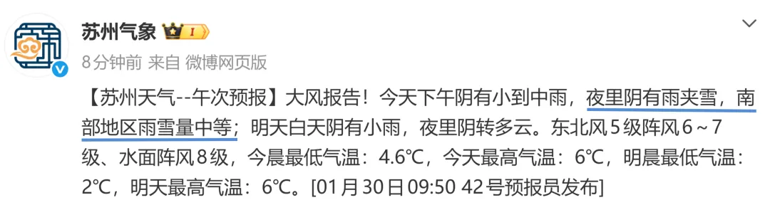 雨雪预报:30日至31日,我省大部分地区有一次降水过程,期间雨雪相态复杂。30日白天,全省大部分地区降雨为主,雨量小到中等,淮北地区有短暂雨夹雪或小雪。