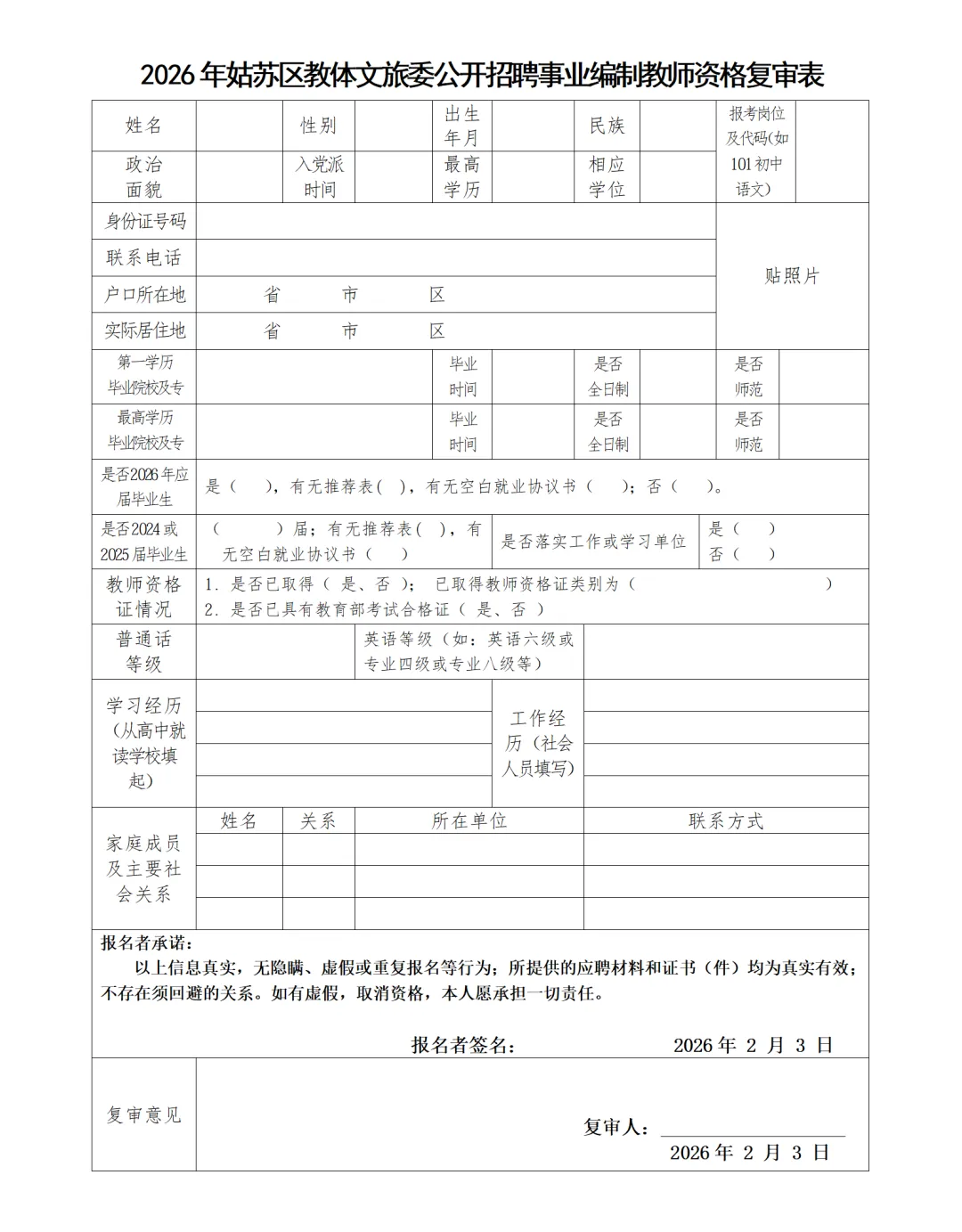 7.报考岗位所需的其他证明材料,具体要求见《2026年苏州市姑苏区教育体育和文化旅游委员会下属学校公开招聘事业编制教师公告》及《岗位简介表》。