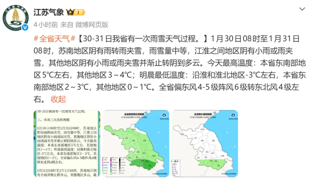 30日夜里至31日早晨,江淮之间中西部及苏南地区有雨夹雪或雪,其中苏南南部小到中雪,最大积雪深度1~3厘米,其他地区积雪不明显,积雪深度0~1厘米。31日白天到夜里,沿江和苏南地区小雨为主,苏南南部有雨夹雪,其他地区阴到多云。31日白天气温较高,积雪融化较快。