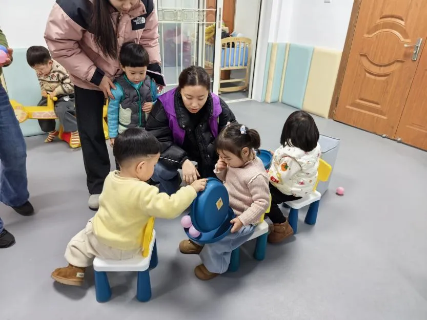 活动伊始,托育员以一场生动有趣的律动操开场,快速打破幼儿与环境、同伴间的陌生感。伴随着轻快的儿歌,教师们弯腰、拍手、转圈,用夸张又温柔的动作引导宝宝模仿互动,迅速调动起现场氛围。结合幼儿年龄特点,托育点精心设计并开展系列趣味活动:“开火车,过桥洞”环节中,小朋友们依次拉住前方同伴的衣角连成“小火车”,有序穿越“山洞”,在趣味互动中培养沟通与协作能力;“口香糖黏哪里”游戏里,家长与幼儿同步聆听教师口令,根据指令完成对应互动动作,有效增进亲子情感联结;“传递幸运球”环节中,小朋友们坐成一排,将自身盘中的小球依次传递给身旁同伴,在专注操作中提升专注力与规则意识。