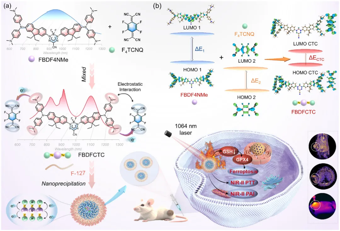 本文报道了一种基于静电强化的超分子电荷转移复合物(FBDFCTC NPs),其由NIR-II染料FBDF4NMe(给体)与F4TCNQ(受体)以1:2比例构建(方案1)。电荷转移态的静电稳定化实现了高效的分子间电荷转移,缩小了能隙并促进了非辐射弛豫,从而在1064 nm处获得了强烈的NIR-II吸收(ε₁₀₆₄ nm = 1.73 × 10⁴ M⁻¹ cm⁻¹,其中ε为摩尔消光系数)和高光热转换效率(η = 56.3%)。除高效光热治疗外,亲电性的F4TCNQ部分能够消耗细胞内谷胱甘肽和半胱氨酸,放大氧化应激并触发外源性铁不依赖性铁死亡。值得注意的是,即使发生部分解离,超分子FBDFCTC NPs仍能保持稳定的NIR-II光热性能,确保了持久的治疗效果。得益于强吸收特性,FBDFCTC NPs还可实现高对比度光声成像,用于精确定位肿瘤及绘制血管网络。本研究通过将深部组织光热治疗与肿瘤微环境响应性铁死亡相结合,确立了电荷转移复合物的静电工程作为构建结构稳定的NIR-II平台的通用策略,为多功能、持久且安全的癌症治疗提供了新范式。