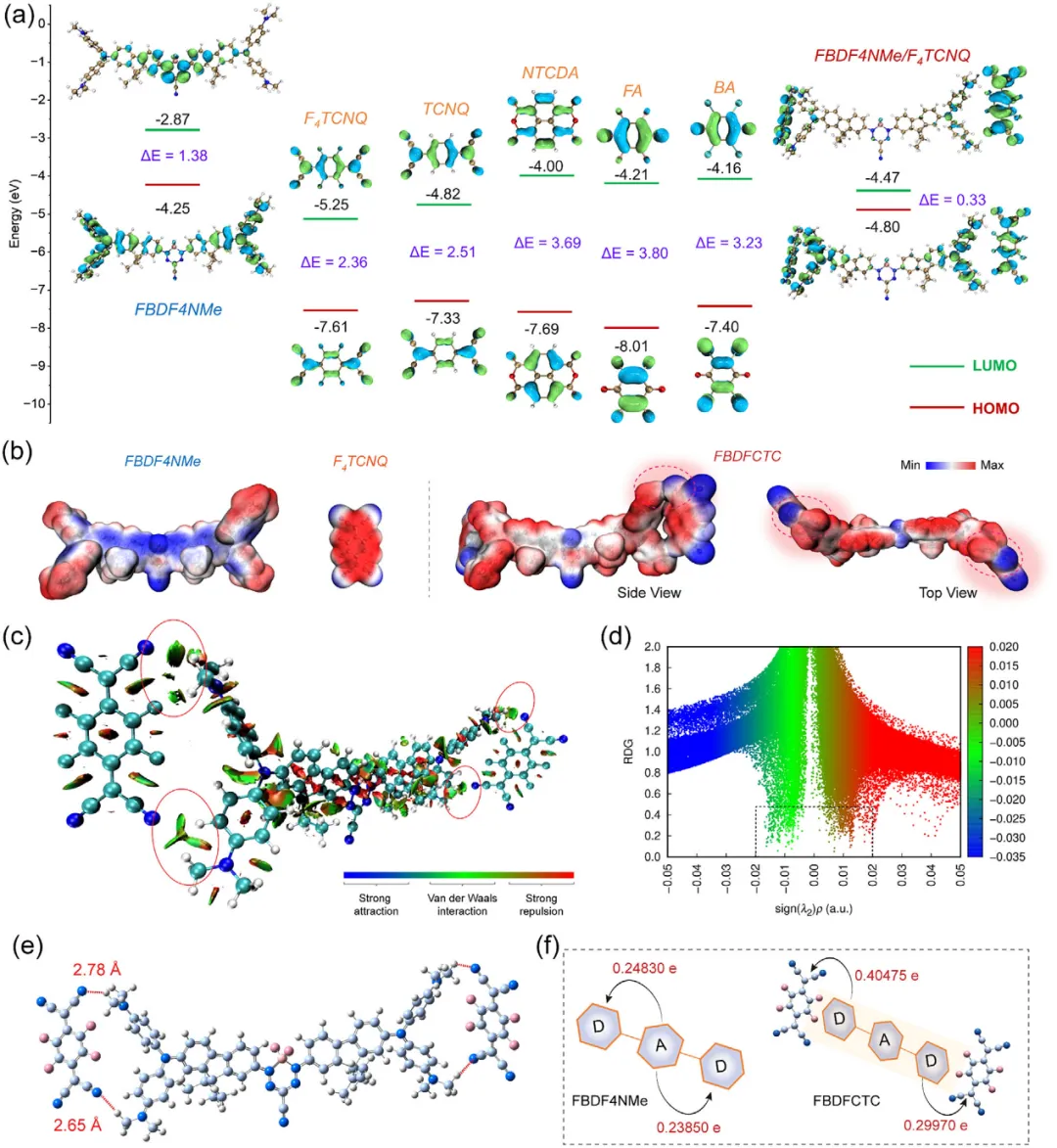 图2.(a)FBDF4NMe、F4TCNQ、TCNQ、NTCDA、FA、BA及FBDFCTC的能级图。(b)FBDF4NMe、F4TCNQ及FBDFCTC的静电势表面。(c)FBDFCTC复合物的sign(λ2)ρ着色IGMH δg_inter等值面及(d)RDG与sign(λ2)ρ之间的散点图。(e)FBDFCTC复合物的结构模型。(f)垂直激发时FBDF4NMe片段与FBDFCTC复合物片段间电荷转移量的示意图。