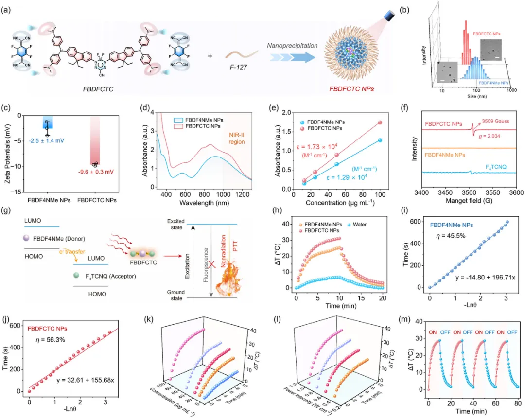 图3(a)FBDFCTC NPs的制备示意图。(b)FBDF4NMe NPs与FBDFCTC NPs的流体动力学直径及透射电子显微镜图像。(c)FBDF4NMe NPs与FBDFCTC NPs的zeta电位。(d)FBDF4NMe NPs与FBDFCTC NPs的吸收光谱。(e)FBDF4NMe NPs与FBDFCTC NPs在1064 nm处的摩尔消光系数。(f)FBDFCTC NPs、FBDF4NMe NPs及F4TCNQ的电子顺磁共振谱。(g)FBDFCTC NPs的工作原理及光热治疗应用示意图。(h)FBDF4NMe NPs(100 µg mL⁻¹)、FBDFCTC NPs(100 µg mL⁻¹)及水在1064 nm激光照射(1.0 W cm⁻²)下的光热升温曲线。FBDF4NMe NPs(i)与FBDFCTC NPs(j)在1064 nm激光照射(1.0 W cm⁻²)下的光热转换效率。(k)不同浓度的FBDFCTC NPs在1064 nm激光照射(1.0 W cm⁻²)下的温度变化。(l)FBDFCTC NPs(100 µg mL⁻¹)在不同激光功率密度下的温度变化。(m)FBDFCTC NPs在1064 nm激光照射(1.0 W cm⁻²,每循环10分钟)下经过五次升/降温循环的光热稳定性评估。