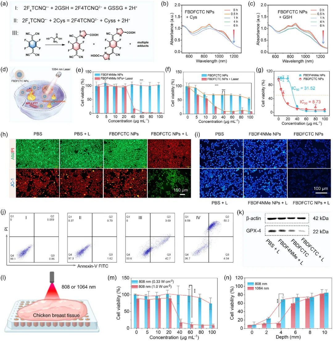 图4(a)F4TCNQ消耗谷胱甘肽/半胱氨酸的示意图。(b,c)加入半胱氨酸和谷胱甘肽后FBDFCTC NPs的吸收光谱。(d)FBDFCTC NPs在肿瘤细胞中的治疗机制示意图。(e,f)4T1细胞在黑暗条件下或经1064 nm激光照射(1.0 W cm⁻²,5分钟)后,与不同浓度FBDF4NMe NPs及FBDFCTC NPs共孵育的细胞活力。误差棒代表平均值±标准差(n=4),*p < 0.001。(g)在1064 nm光照射下,FBDF4NMe NPs和FBDFCTC NPs处理的4T1细胞活力曲线及计算得出的半抑制浓度。误差棒代表平均值±标准差(n=4)。(h)不同条件处理下4T1细胞的活/死染色及JC-1线粒体膜电位染色。(i)不同处理后细胞内谷胱甘肽水平的荧光图像。(j)不同处理诱导的流式细胞术检测结果(I: PBS;II: PBS + 激光;III: FBDFCTC NPs;IV: FBDFCTC NPs + 激光)。(k)蛋白质印迹法检测4T1细胞中GPX4蛋白水平。(l)鸡胸组织穿透实验示意图。(m)在808 nm激光照射(0.33 和 1.0 W cm⁻²)下,与FBDFCTC NPs共孵育的4T1细胞活力。误差棒代表平均值±标准差(n=4),*p < 0.001。(n)在1064 nm(1.0 W cm⁻²,5分钟)和808 nm(1.0 W cm⁻²,5分钟)光照射下,与FBDFCTC NPs共孵育的4T1细胞在不同深度鸡胸组织中的活力。误差棒代表平均值±标准差(n=4),***p < 0.001。