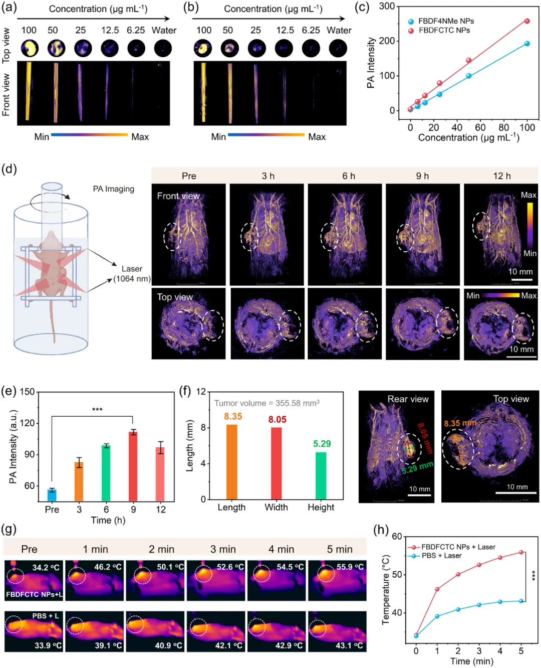 图5.(a)FBDFCTC纳米颗粒与(b)FBDF4NMe纳米颗粒在不同浓度下的光声图像。(c)光声信号强度对纳米颗粒浓度的依赖性。(d)小鼠体内光声图像及(e)静脉注射FBDFCTC纳米颗粒后,不同时间点肿瘤部位对应的光声信号强度。误差棒代表平均值±标准差(n=3),p < 0.001。(f)小鼠全身三维光声成像及对应的肿瘤尺寸。(g)1064 nm激光照射下小鼠的热成像图及(h)肿瘤部位温度变化。p < 0.001。