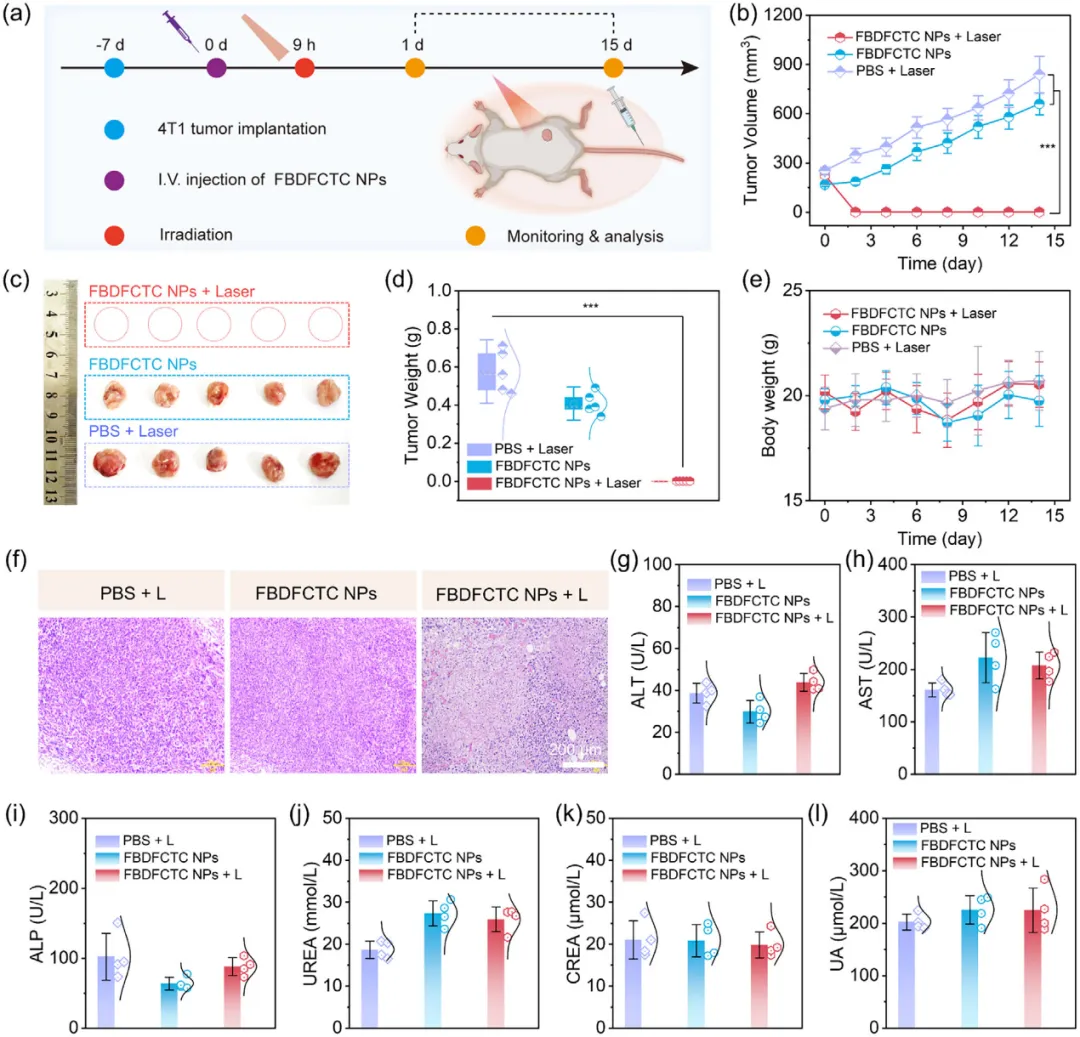 图6(a)光热治疗示意图。(b)肿瘤体积变化曲线。误差棒代表平均值±标准差(n=5),*p < 0.001。(c)各组小鼠的肿瘤实物图。(d)不同治疗组小鼠的肿瘤重量。误差棒代表平均值±标准差(n=5),*p < 0.001。(e)小鼠体重变化曲线。误差棒代表平均值±标准差(n=5)。(f)治疗后肿瘤组织的H&E染色切片。(g-l)血清生化检测结果。误差棒代表平均值±标准差(n=4)。