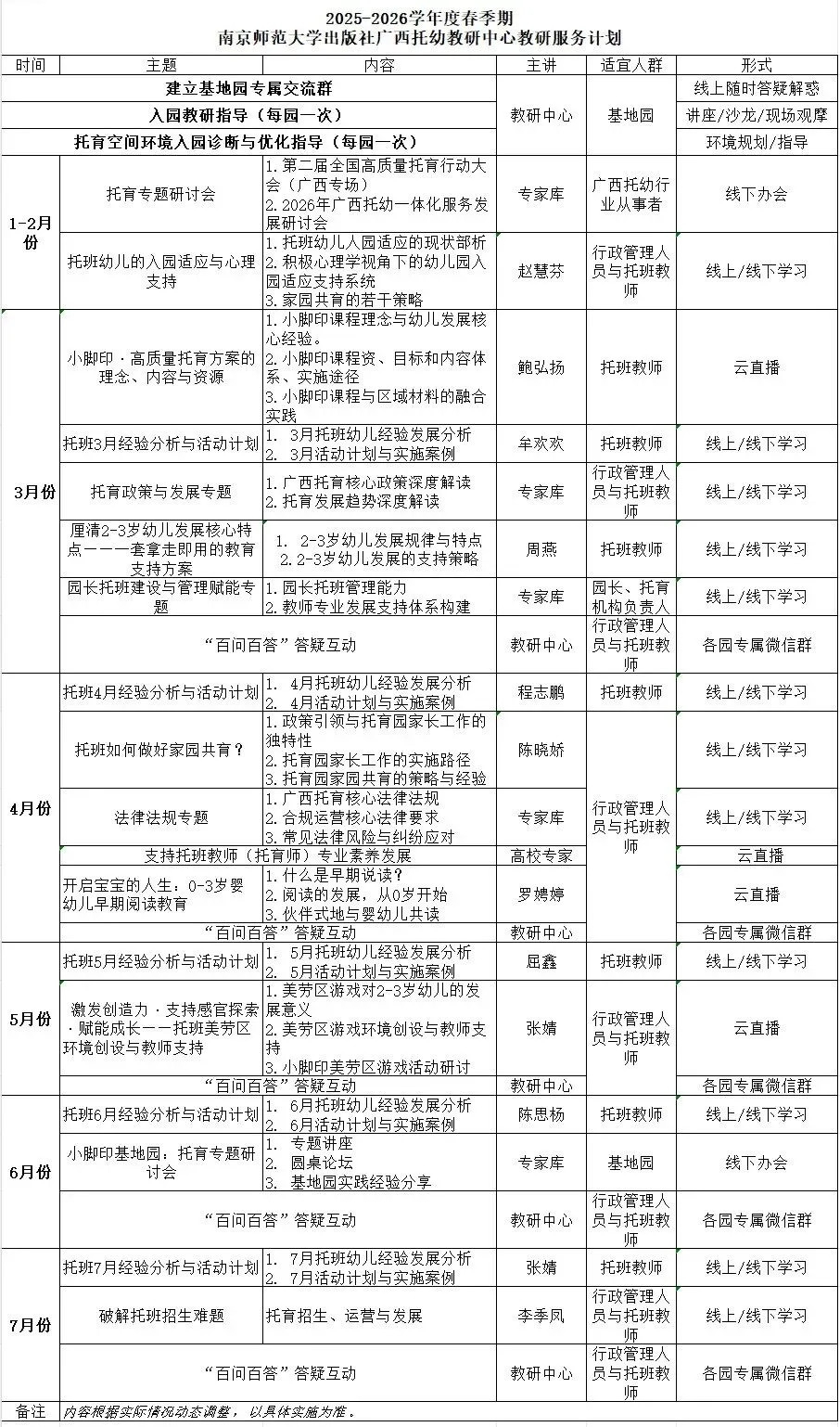 春启新程,研育未来。南京师范大学出版社广西托幼教研中心结合广西区域托幼行业发展实际,在广泛征求幼儿园、托育机构及一线教师的实际教研需求的基础上,制定了《2025-2026学年度春季期教研服务计划》。