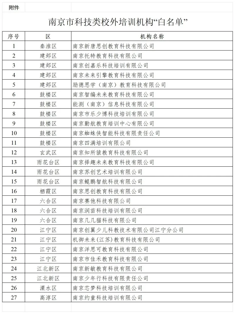为落实《省教育厅等五部门关于规范引导第三方机构参与中小学课后服务的通知》要求,支持并规范引导非学科类校外培训机构有序参与中小学课后服务,现将经科技、体育部门审批(核),在市场监管、民政部门登记注册,并实施全流程监管的科技类、体育类校外培训机构“白名单”(见附件)向社会公布(截至2026年1月30日)。希望纳入“白名单”的校外培训机构合法合规开展培训。“白名单”实行动态管理(以最新公布的名单为准),对“白名单”中存在违法违规行为的校外培训机构,将及时从“白名单”中清除。