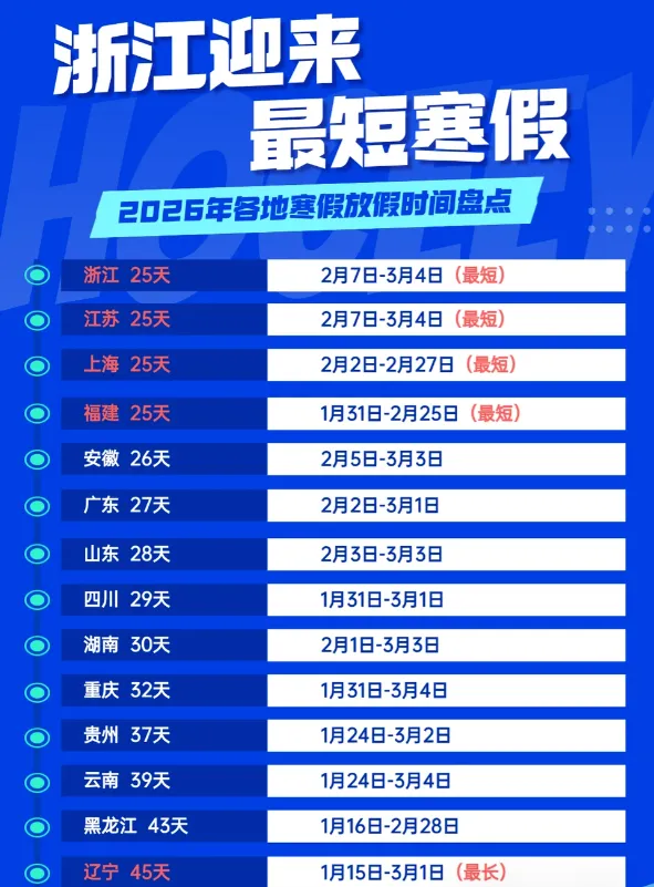 2026浙江,南京,上海,广东等全国寒假安排对比,浙江“最短”?假期这样安排开学稳赢!