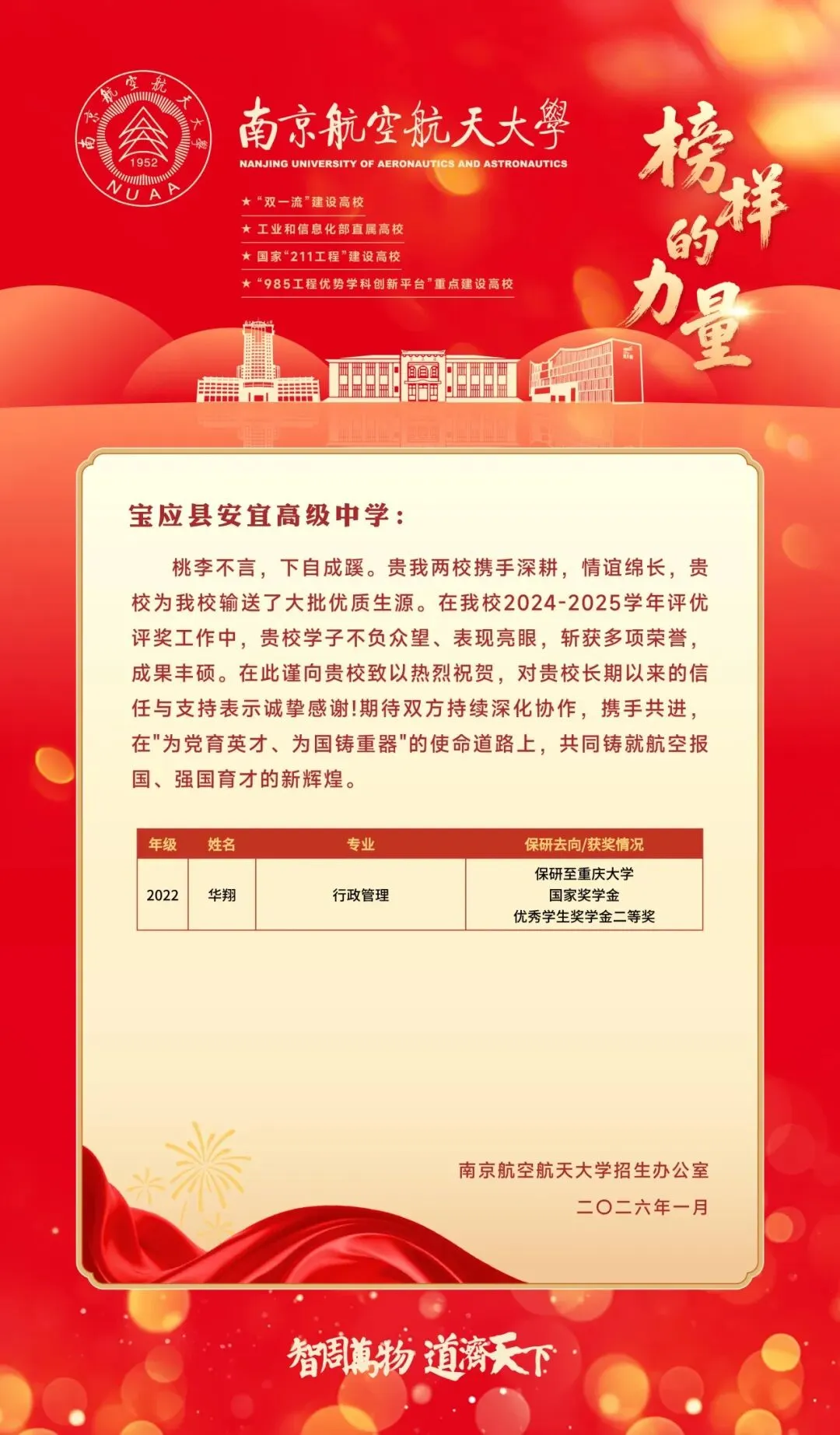 桃李不言,下自成蹊。近日,南京航空航天大学向我校发来喜报。在2024-2025学年评优评奖工作中,我校学子不负众望、表现亮眼,斩获多项荣誉,成果丰硕。