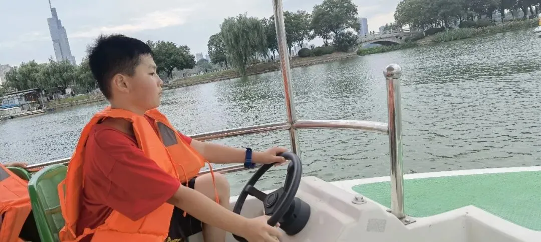 城墙就不去了,孩子们对船比较感兴趣。我们租了条电动船,在开阔的湖面上慢慢开了一个钟头。湖风阵阵吹来,终于有了点凉意,让人感到一丝久违的舒坦。玄武湖是古秦淮河遗留下来的水域,从六朝时的皇家园林湖泊,变成了如今南京城中心的“心脏”,这份变迁本身,就值得来看一看。