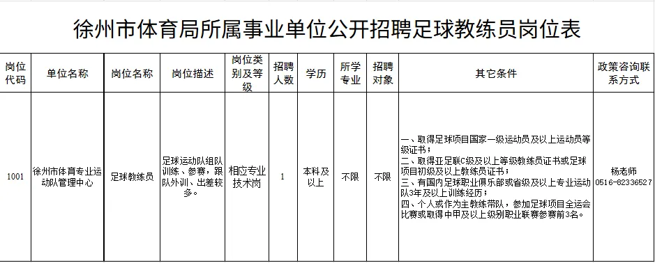 徐州市体育局所属事业单位公开招聘足球教练员公告(1名)