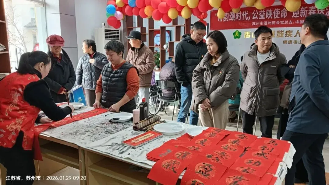 新春将至,墨香传情。1月29日上午,苏州市工商联副主席、机关单位书记谢文年携温州商会、中国狮子联会江苏圆梦服务队一行15人,在香山街道蒋墩社区党委副书记薛敏方等陪同下,走进香山街道残疾人之家,开展“诗韵颂盛世 公益映使命”主题迎新春送温暖活动。