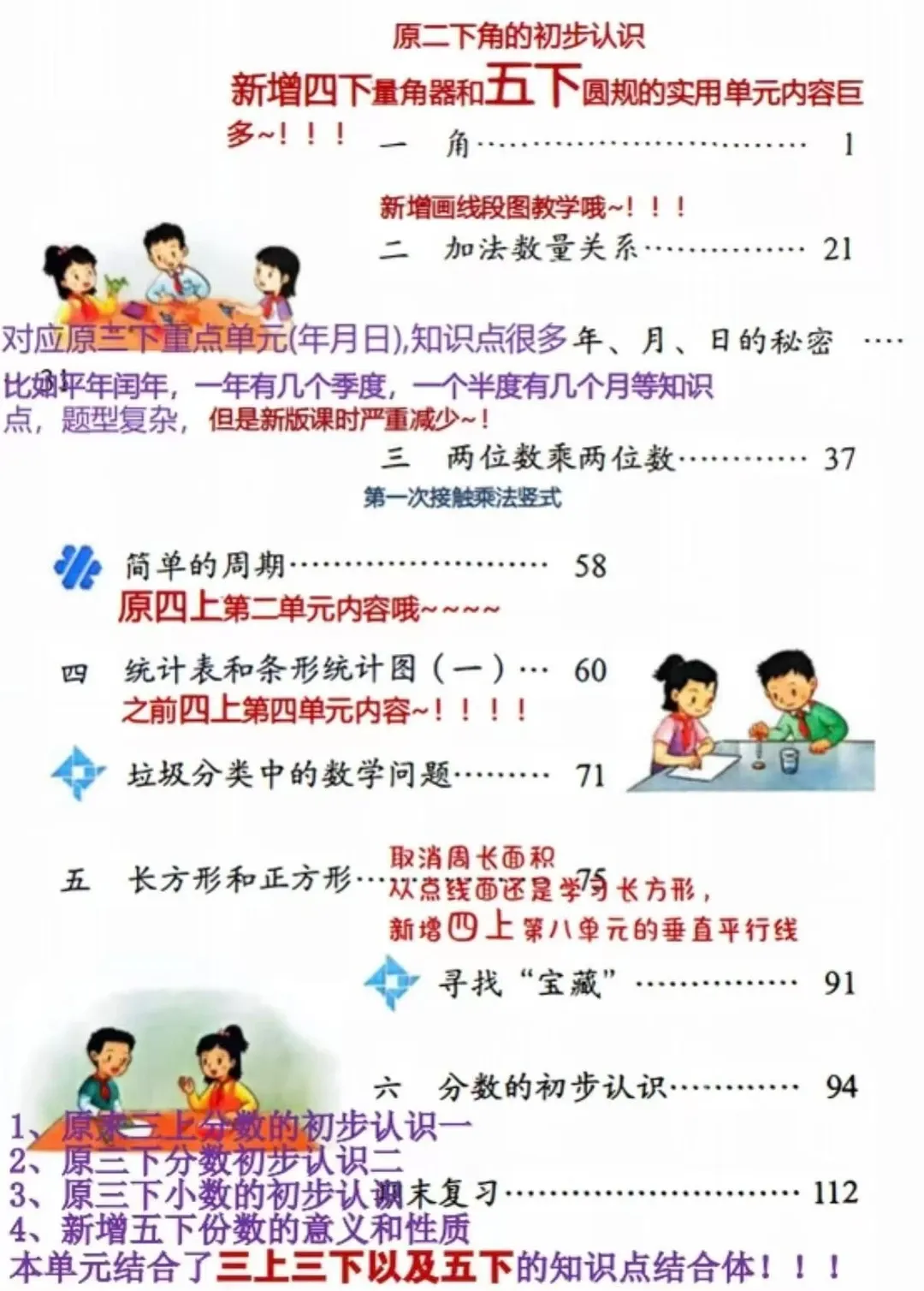 仅有“两位数乘两位数”“年、月、日”“长方形和正方形”“分数的初步认识”四个单元内容保留,但顺序做了重新安排。