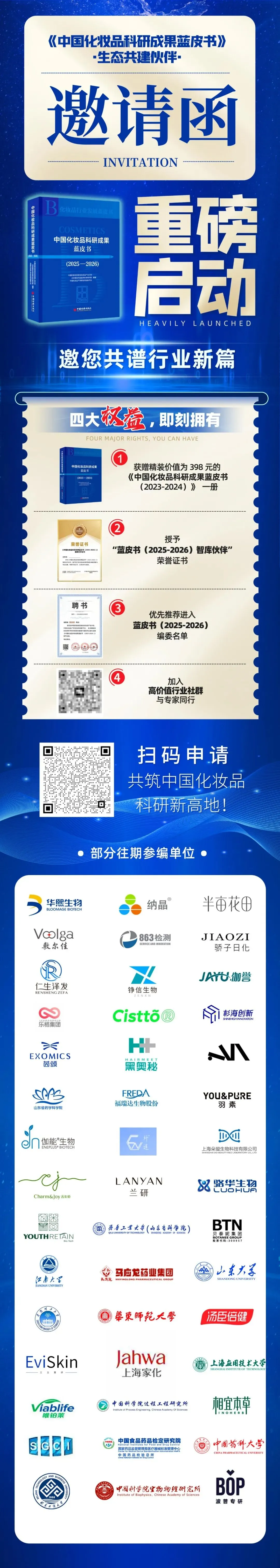 为系统呈现中国化妆品领域近两年的科研突破与创新趋势,《中国化妆品科研成果蓝皮书(2025-2026)》现面向全国征集编委专家及支持单位。入选机构及专家将载入行业权威文献,共享传播资源,共建产学研生态。
