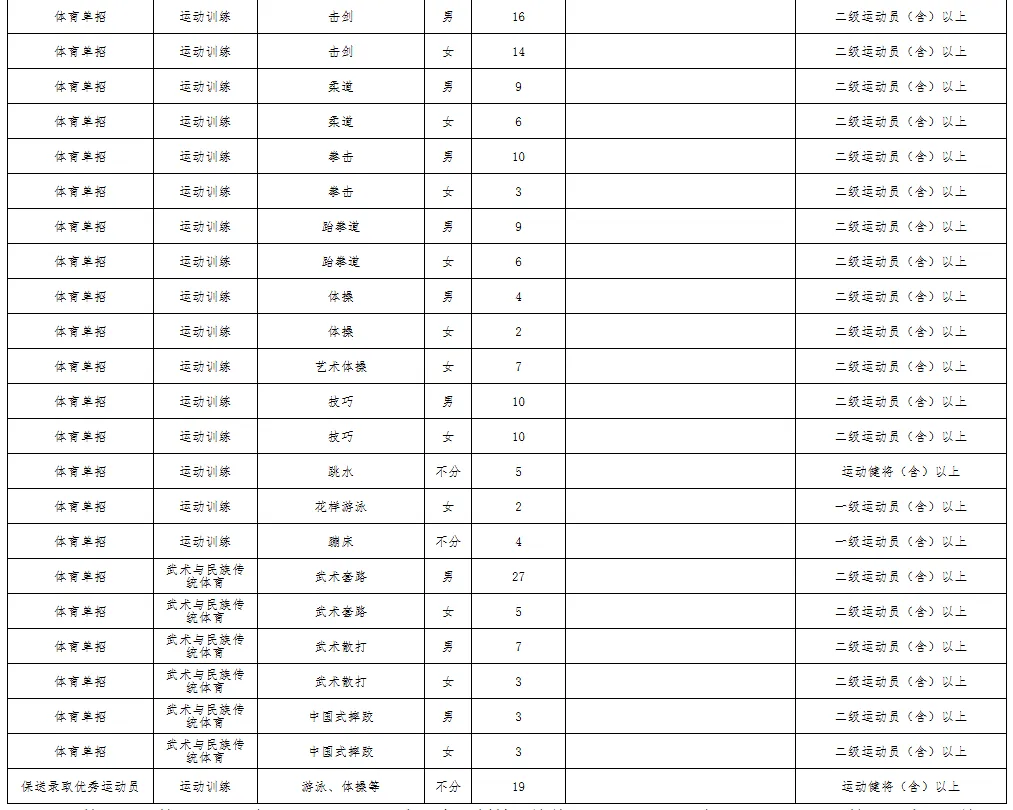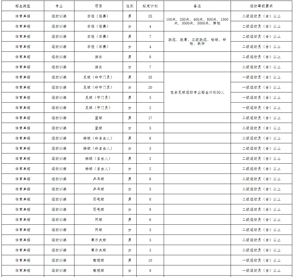 招收二级运动员(含)以上的项目:田径(100米、200米、400米、800米、1500米、3000米、5000米、跨栏、跳远、跳高、三级跳远、铅球、标枪、铁饼)、游泳、篮球、排球、乒乓球、羽毛球、网球、高尔夫球、击剑、跆拳道、柔道、拳击、体操、艺术体操、技巧。