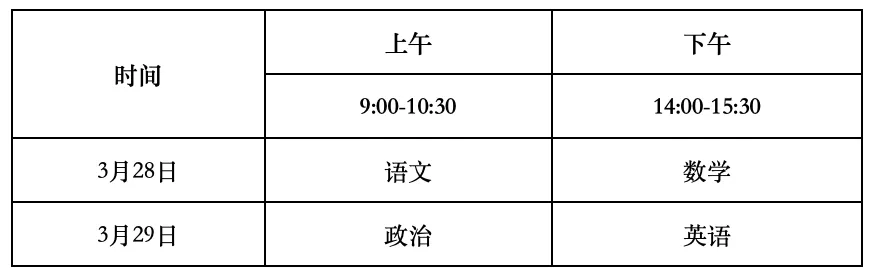 (1)文化考试科目为语文、数学、政治、英语四科,每科满分为150分,四科满分为600分,使用国家通用语言文字作答。