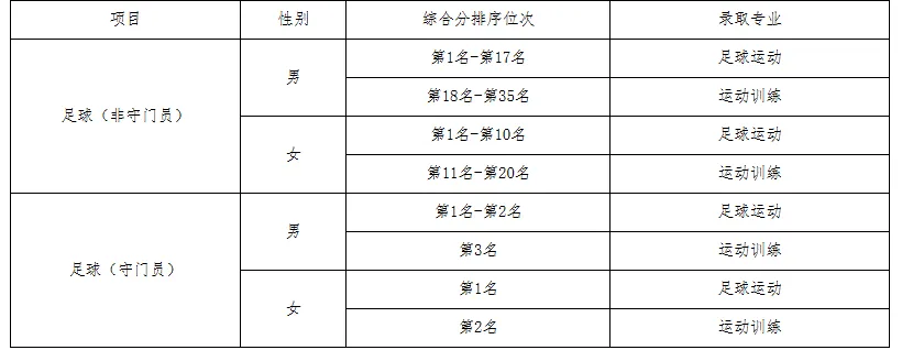 4.跳水、蹦床项目不分男女录取,其他项目均按性别分别进行录取。田径项目按田赛、径赛两类分别录取;排球项目按非自由人、自由人分别录取;足球项目按非守门员、守门员分别录取。足球项目考生在进行专业分配时,按照综合分排序,优先录取至足球运动专业,录满后再录取至运动训练专业,具体如下: