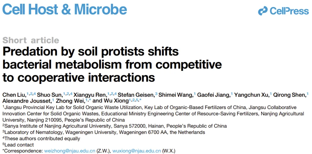 2026年1月29日,Cell Press旗下期刊《Cell Host & Microbe》在线发表了南京农业大学沈其荣院士团队的研究论文“Predation by soil protists shifts bacterial metabolism from competitive to cooperative interactions”。该研究聚焦土壤微食物网中原生动物对细菌代谢互作的调控作用,研究系统揭示了原生动物的捕食压力可促使细菌群落的代谢互作模式由资源竞争转向代谢合作,为理解土壤微生物功能形成及微食物网调控提供了新的见解。