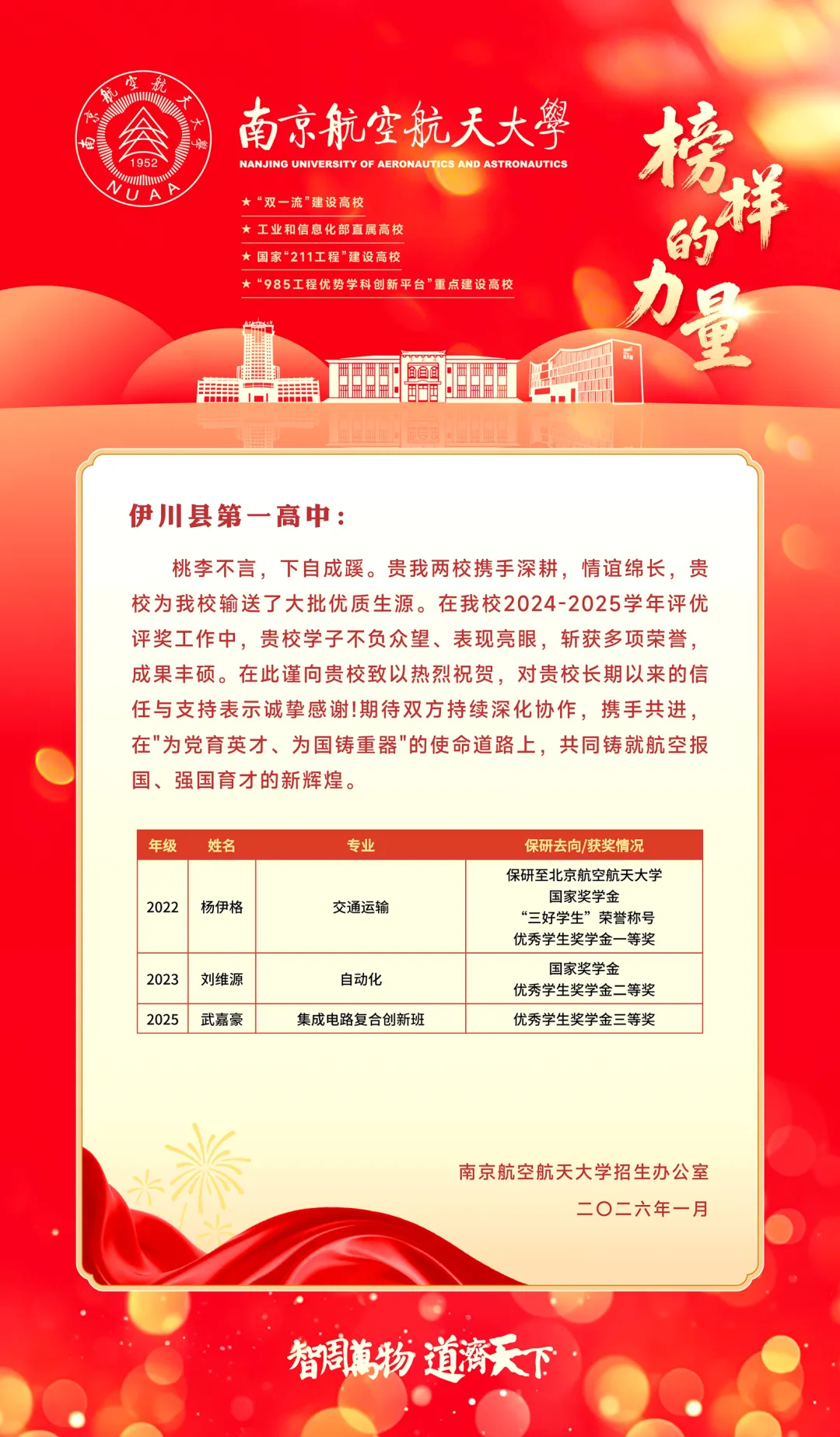 桃李不言,下自成蹊。贵我两校携手深耕,情谊绵长,伊川县第一高中为我校输送了大批优质生源。在我校2024-2025学年评优评奖工作中,贵校学子不负众望,表现亮眼,斩获多项荣誉,成果丰硕。在此谨向贵校致以热烈祝贺,对贵校长期以来的信任与支持表示诚挚感谢!期待双方持续深化协作,携手共进,在"为党育英才、为国铸重器"的使命道路上,共同铸就航空报国、强国育才的新辉煌。