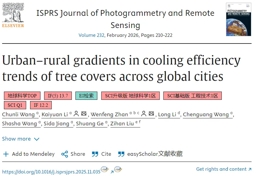 Chunli Wang, Kaiyuan Li, Wenfeng Zhan, et al. Urban–rural gradients in cooling efficiency trends of tree covers across global cities, ISPRS Journal of Photogrammetry and Remote Sensing, Volume 232, 2026, Pages 210-222, ISSN 0924-2716, https://doi.org/10.1016/j.isprsjprs.2025.11.035.