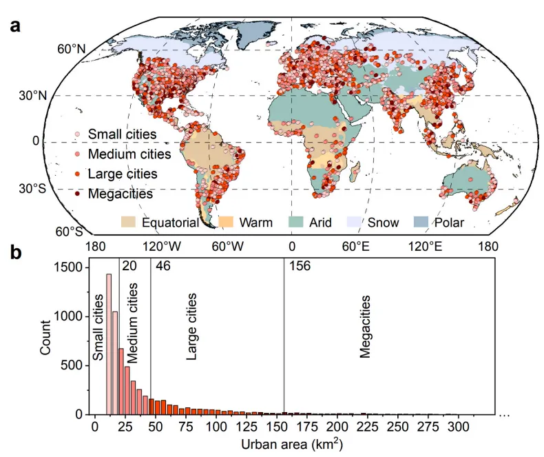 图1. 全球范围内选定城市的空间分布(a)及不同城市规模的频次统计(b)。