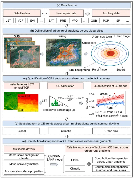 理解树木覆盖的降温效率(Cooling Efficiency, CE)趋势如何响应背景气候变化及局部城市化,对于优化城市绿化策略至关重要。然而,以往的研究大多聚焦于全市尺度的 CE 趋势,且往往局限于少数城市或特定的地理范围。因此,全球范围内城乡梯度上 CE 趋势的空间异质性及其背后的驱动因素仍不明晰。本研究利用 MODIS 获得的地表温度和树木覆盖数据,量化了 2003 年至 2020 年间全球 5,000 多个城市在六类城乡梯度(即:城市核心区、新城区、城市边缘区、近郊、远郊和乡村背景区)的夏季白天 CE 趋势。