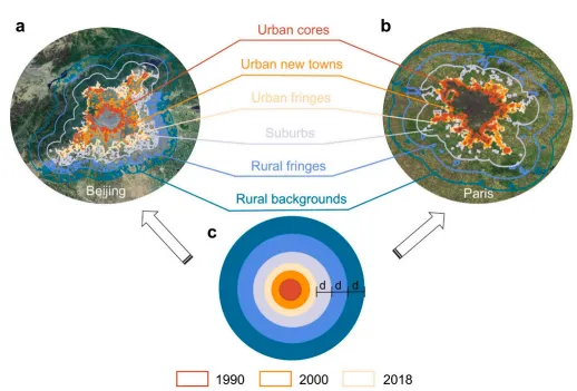 图3. 城市内部城乡梯度的划分,以北京(a)和巴黎(b)为例。子图(c)中的变量“d”代表划定乡村梯度时所采用的缓冲距离。