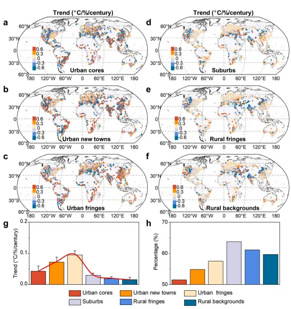 图5. 全球不同城乡梯度下降温效率(CE)趋势的空间格局(a–f)及平均CE趋势的差异(g)。图(h)显示了在这些梯度下呈现CE增加趋势的城市百分比。