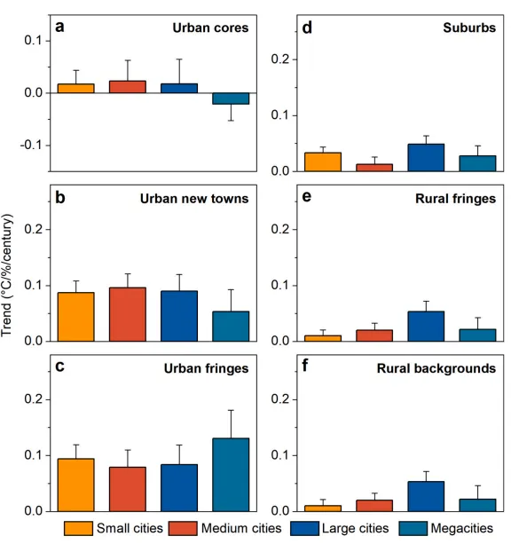 图7. 不同城市规模下,沿城乡梯度的降温效率(CE)趋势变化。