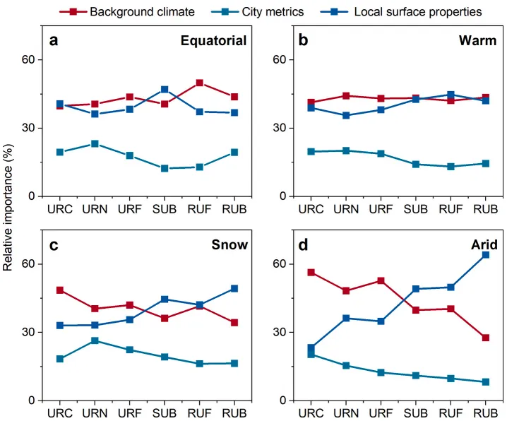 图9. 夏季白天,在不同气候条件下,城乡梯度中宏观尺度的大气背景气候、中观尺度的城市指标以及微观尺度的局地地表属性对降温效率(CE)趋势的相对重要性。