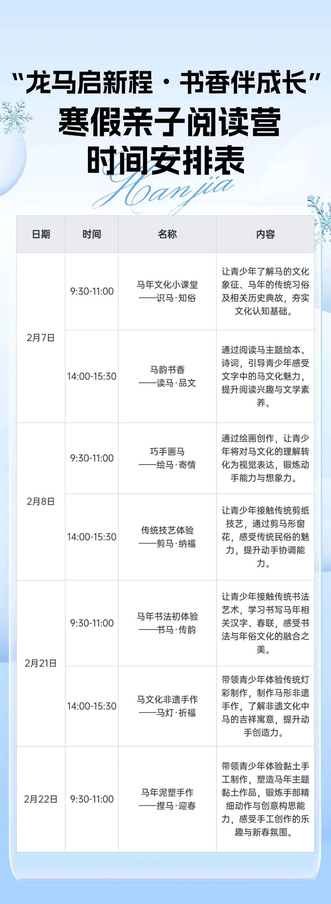 主题聚焦马年:从文化认知到动手创作,从传统技艺到书香浸润,打造完整马文化探索链条,让孩子全方位感受马的精神内涵与民俗魅力。
