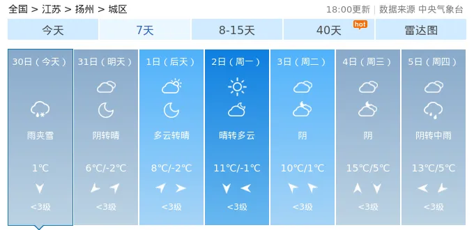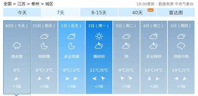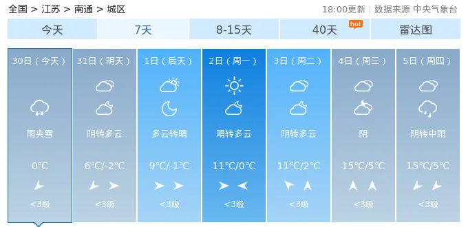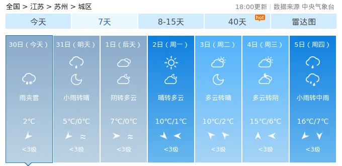 30日(今天):雨夹雪,气温:0℃31日(明天):阴转多云,气温:6℃/-2℃1日(后天):多云转晴,气温:9℃/-1℃2日(周一):晴转多云,气温:11℃/0℃3日(周二):阴转多云,气温:11℃/2℃4日(周三):阴,气温:15℃/5℃5日(周四):阴转中雨,气温:15℃/5℃
