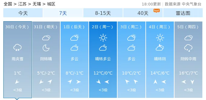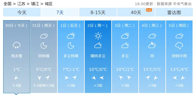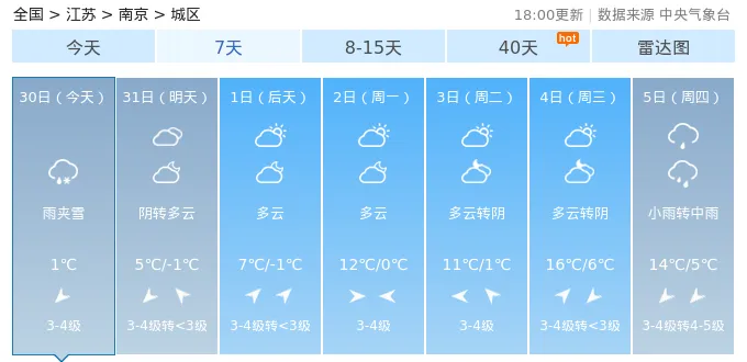 30日(今天):雨夹雪,气温:1℃31日(明天):阴转晴,气温:6℃/-1℃1日(后天):多云转晴,气温:7℃/-1℃2日(周一):晴转多云,气温:11℃/1℃3日(周二):阴转多云,气温:10℃/2℃4日(周三):多云转阴,气温:15℃/6℃5日(周四):阴转中雨,气温:14℃/6℃