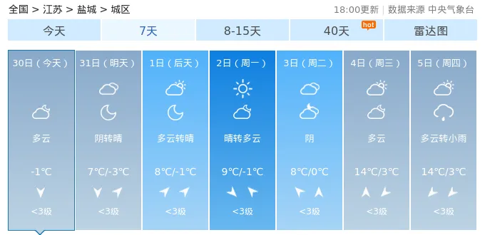 30日(今天):多云,气温:-1℃31日(明天):阴转晴,气温:7℃/-3℃1日(后天):多云转晴,气温:8℃/-1℃2日(周一):晴转多云,气温:9℃/-1℃3日(周二):阴,气温:8℃/0℃4日(周三):多云,气温:14℃/3℃5日(周四):多云转小雨,气温:14℃/3℃