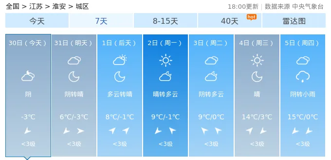 30日(今天):阴,气温:-3℃31日(明天):阴转晴,气温:6℃/-2℃1日(后天):晴,气温:9℃/-2℃2日(周一):晴转阴,气温:9℃/-1℃3日(周二):阴,气温:10℃/0℃4日(周三):多云转阴,气温:14℃/4℃5日(周四):阴转多云,气温:14℃/0℃