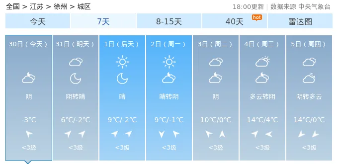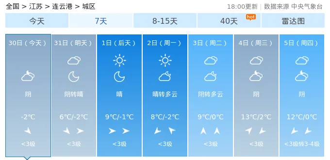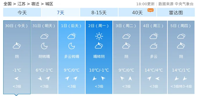 30日(今天):阴,气温:-3℃31日(明天):阴转晴,气温:6℃/-3℃1日(后天):多云转晴,气温:8℃/-1℃2日(周一):晴转多云,气温:9℃/-1℃3日(周二):阴转多云,气温:9℃/0℃4日(周三):晴,气温:14℃/3℃5日(周四):阴转小雨,气温:15℃/0℃