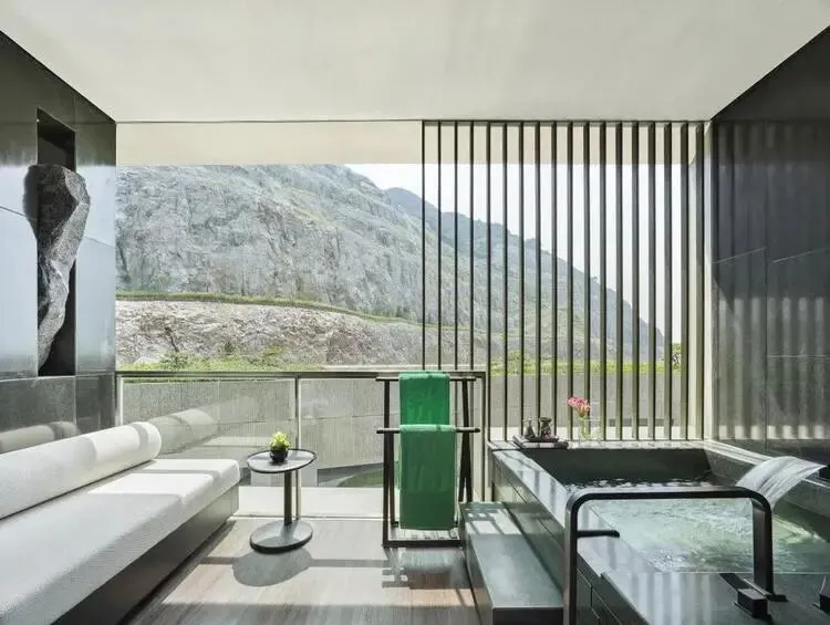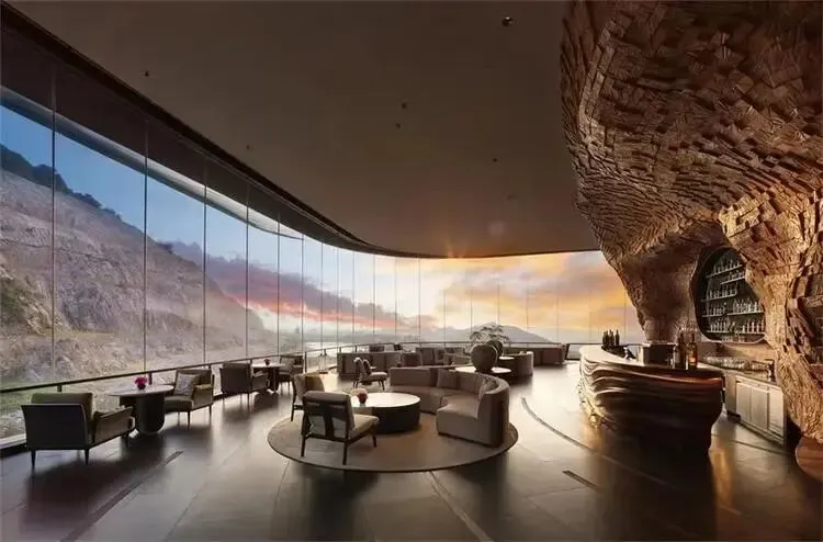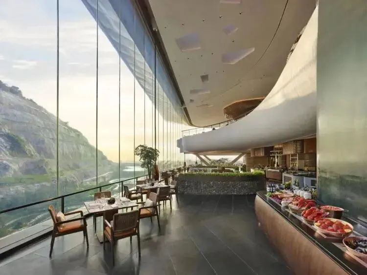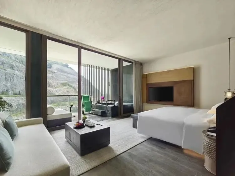 拥有了180°巨幅全景落地窗,宽敞的休憩空间与矿谷崖壁的迷人风光映入眼帘,为宾客带来感官享受及崭新发现。